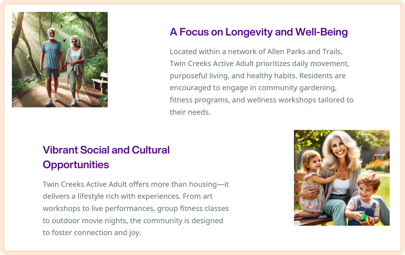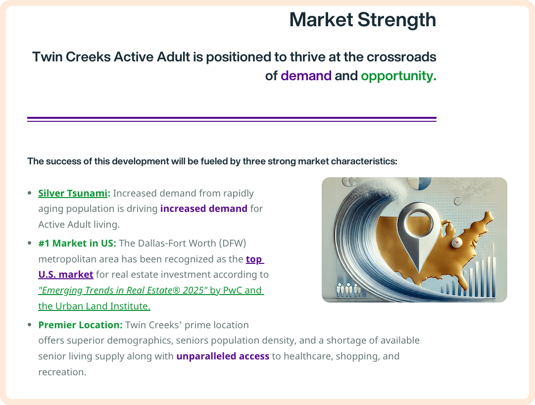 The demand for communities catering to this group of the population is driven by the “Silver Tsunami” as over 10,000 US citizens are turning 65 every day. Twin Creeks stands apart—not just by responding to demographic trends, but by delivering an unmatched location, lifestyle, and investment opportunity in North Texas.