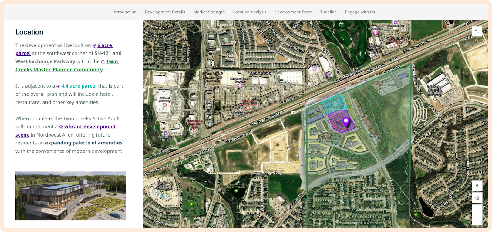 David Hicks Company engaged with Locaition Matters, an Esri Gold Partner, to create a modern, investor-ready pitch deck for the upcoming Twin Creeks Active Adult community in Allen, Texas. Leveraging ArcGIS StoryMaps, the presentation brought together a wide range of critical data into one cohesive, visually compelling narrative. This approach allowed DHC to clearly and persuasively communicate the project’s value, streamlining the investor decision-making process. Instead of spending hours conducting independent research, potential investors could access all essential information in a single StoryMap: making it easier and faster to secure the capital needed for development.